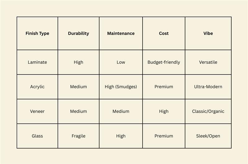 Explore wardrobe finish types like laminate, acrylic, veneer, and glass with pros, costs, and tips to choose the right finish for your home.