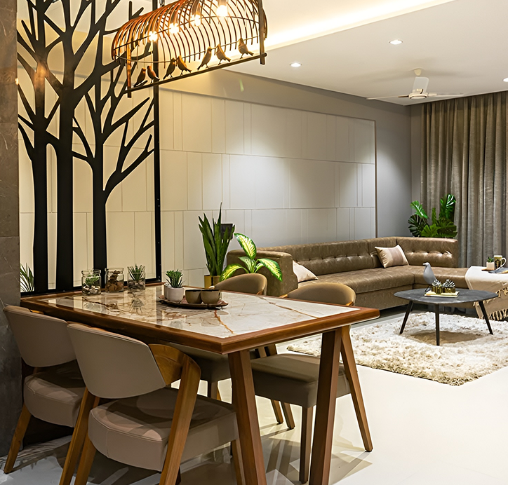 Interior designers in Marathahalli, including Ineazy Interior Designers, offer complete home solutions such as living room interiors, modular kitchens, dining designs, wardrobes, entertainment units, false ceilings, lighting, and customized wall finishes like wallpaper, paneling, and paint.